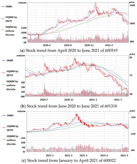 Three randomly selected stocks were taken as an example, and the predicted trends by three different methods were compared with the actual trends over different time periods. The results are shown in Figure 7 (The grey columns represent an increase, while the red columns represent a decrease). For the stock with code 600519, the predicted trend from August 2020 to July 2021, as determined by HMM, best aligns with the actual trend, as shown in Figure 7a. For the stocks with codes 601318 and 600022, HQMM performs the best, as shown in Figure 7b,c. Notably, for all these stocks, the prediction results of HQMM with the data discretized by GMM and MVTF are always superior to those of HQMM with evenly discretized data. This further demonstrates that selecting multiple stocks and various time periods to evaluate the model’s average prediction capability is necessary. By applying similar operations to our selected 15 stocks and considering different time periods, the (FC) and (R) are calculated by three different prediction methods, and the detailed results are summarized in Table 4, Table 5, Table 6 and Table 7.