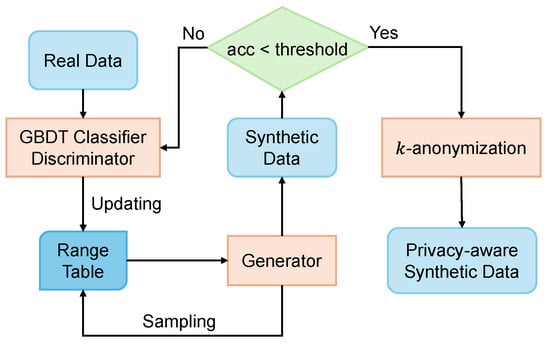 The proposed methodology, Adversarial Gradient Boosting Decision Tree (AGBDT), integrates gradient boosting trees into an adversarial learning framework to address the limitations of existing table data generation approaches. As illustrated in Figure 1, the system comprises three core components: (1) a generator that synthesizes privacy-preserving synthetic data, (2) a discriminator that distinguishes real from synthetic records using gradient boosting decision trees, and (3) a range table that dynamically constrains attribute value ranges to prevent overfitting.