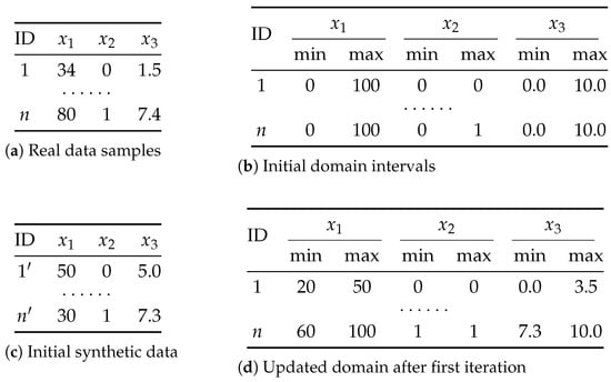 The workflow begins with initial synthetic data generation, where a range table (Table (b) in Figure 2) is constructed by extracting minimum and maximum values for each attribute from the original dataset (Table (a) in Figure 2). Synthetic records are generated by uniformly sampling values within these ranges (Table (c) in Figure 2). For example, an integer-type attribute with a range of [0, 100] would produce synthetic values randomly drawn from this interval.