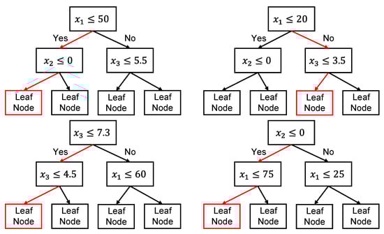 A gradient boosting tree classifier learns to distinguish real and synthetic data during discriminator training through iterative 5-fold cross-validation. The discriminator’s decision paths are then used to guide the generator adaptation. Inspired by GTs [], the proposed method augments each boosting round with a “range table” that records split conditions across all features. The generator retrains its gradient boosting trees using discriminator-predicted labels, updating the range table by narrowing attribute value boundaries according to the discriminator’s splitting criteria. For example, as illustrated in Figure 3, record in Figure 2 traverses eight split predicates to reach a leaf node, at which point the generator uses these predicates to tighten its intervals to , , and ; the updated range table is shown in Table (d) in Figure 2. Such training processes of gradient boosting tree classifiers for the discriminator and generator are iterated until the discriminator’s classification accuracy falls below a predefined threshold, ensuring synthetic data convergence toward the real data distribution.