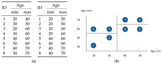 For example, in Figure 4a, the original range table contains age ranges such as for and for . The Mondrian algorithm recursively partitions this space by selecting a random dimension (e.g., minimal value of age (Age_min) or maximum value of age (Age_max)) and splitting it at the median value until each partition contains at least k records. As shown in Figure 4b, IDs are merged into a single partition after splitting the Age_min dimension at 35 and the Age_max dimension at 50. The generalized range for these IDs becomes , replacing their original ranges and . This process ensures that any synthetic record generated from the anonymized range table cannot be uniquely linked to fewer than k original records, thereby satisfying k-anonymity. The final anonymized range table (Figure 4a) guarantees that each generalized range corresponds to at least k original records. Synthetic data is then regenerated within these generalized ranges, balancing privacy protection with statistical utility.