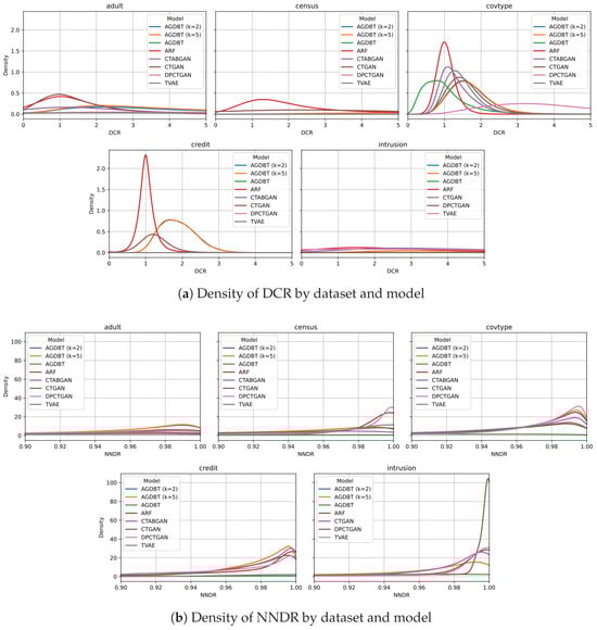 We adopt the NewRowSynthesis metric [], which evaluates the proportion of synthetic records that exactly match records in the original data (i.e., , where m is the number of matching synthetic records with the original data and t is the number of total synthetic records). The metric ranges from 0 (all synthetic records exist in the original data) to 1 (all synthetic records are novel). Table A3 reports the average and worst-case values across five trials, rounded to four decimal places. Best results will be marked in bold. Without k-anonymization, AGBDT generated the lowest proportion of novel records (highest privacy risk). However, applying anonymization reduced the overlap with original records, achieving parity with baseline models on almost all datasets.
