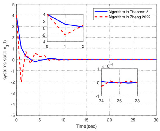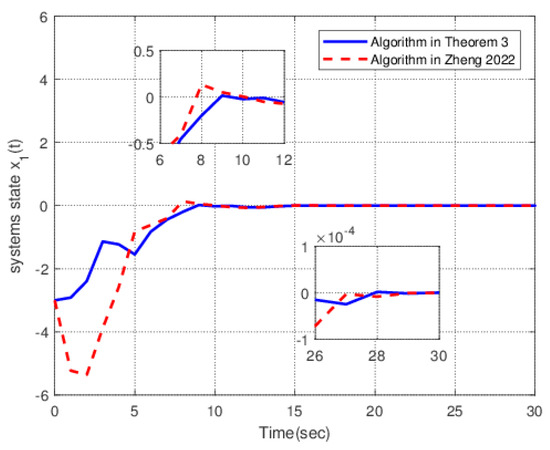 Figure 3 shows the variation in systems state under two algorithms. The solid line is the response diagram of the systems state under the control action designed by Theorem 4. The dotted line is the response diagram of the systems state under the control action designed by the method given in [20]. The solid line converges to a small neighborhood of origin within 7 s. The dotted line converges to a small neighborhood of origin only after 10 s, and the convergence speed is slow. The overshoots of the two lines are small, and the amplitude does not exceed 0.1.
