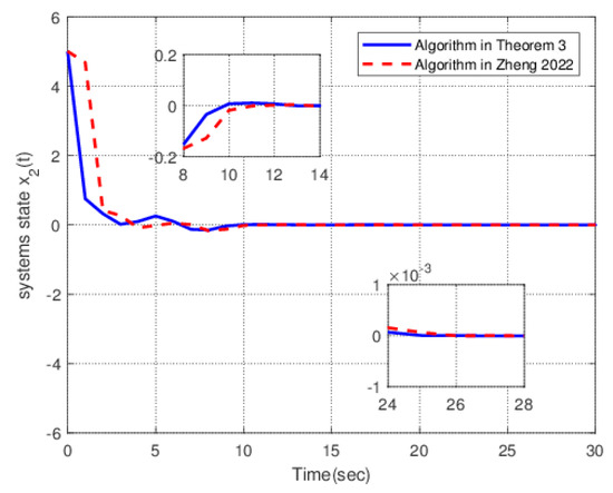 Figure 2 shows the variation in systems state under two algorithms. The solid line is the response diagram of the systems state under the control action designed by Theorem 4. The dotted line is the response diagram of the systems state under the control action designed by the method given in [20]. It is easy to see from the graph that the solid line converges to 0 faster than the dotted line. The smoothness and overshoot of solid lines are significantly better than those of dotted lines.