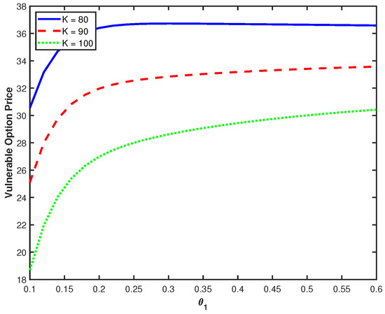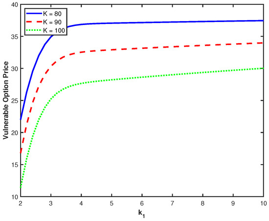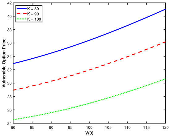 Figure 1 illustrates the relationship between the underlying asset price and vulnerable option values for three different strike prices (). As expected, option values increase monotonically with the underlying asset price. Interestingly, the vertical distance between curves decreases as S(0) increases. Figure 2 examines the effect of the issuer’s asset value on option prices, revealing an exponential growth pattern. The relationship shows that option values increase dramatically as rises, with the rate of increase accelerating at higher issuer asset values. As the issuer’s assets increase relative to the default boundary, the probability of default decreases exponentially, leading to a corresponding exponential increase in option value. The convexity of option value in relation to reflects the fundamental nature of option payoffs, whereas exponential growth with captures the rapidly decreasing default probability.