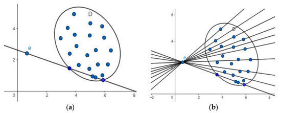 As shown in Figure 2a, there is a point and a set in a two-dimensional plane. To calculate the extension distance between point and set , first draw a straight line through set that passes through point . According to Equation (1), the extension distance between point and the points on this line that belong to set can then be calculated as follows: