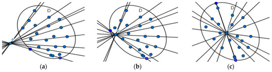 As shown in Figure 5a, point is located outside set . There are three possible scenarios when traversing the set at a fixed angle.
