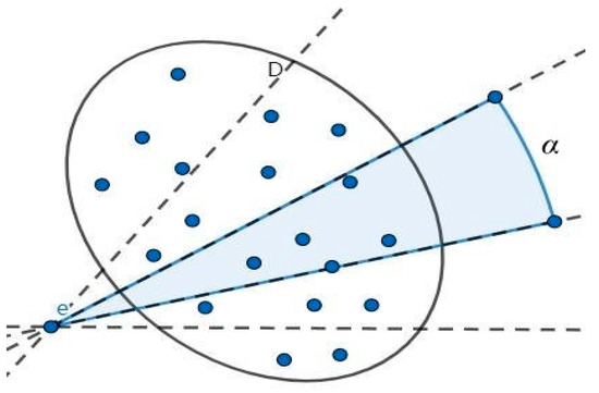 As demonstrated above, the method can be extended to a two-dimensional plane in order to describe the relationship between a point and a set. However, in practical applications, the line traversal method is too strict in terms of data point distribution and involves a high number of calculation steps, due to the varying distribution of data points. It is evident that the angle traversal method is further adopted to enhance calculation efficiency. As demonstrated in Figure 4, traversing the set from a point using a fixed angle not only reduces the requirements for data point distribution but also improves traversal computation efficiency.