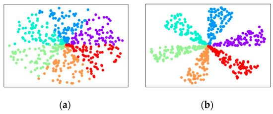 In order to verify the feasibility of the algorithm, it was compared with common clustering algorithms and the algorithm before improvement through experiments. The distribution of the data sets utilized in the experiment is illustrated in Figure 7. Each data set contains 300 sample points, which are uniformly divided into six clusters.
