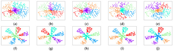 Dataset B is a simplified version of dataset A. The six clusters are distributed in a circular dataset in a fan-shaped pattern, but in dataset B, the clusters only touch each other in the center. There are also certain blank areas on both sides of each cluster’s fan shape. Notwithstanding this fact, the conventional clustering algorithms continue to generate the same error as with dataset A: they categorize the center of dataset B as a solitary cluster. In a similar manner, the remaining sample points surrounding the central part of dataset B are to be divided into five clusters by these algorithms. However, in reality, there are six clusters. It is evident that, due to the presence of blank intervals between the clusters in dataset B, the clustering errors of the algorithm are more pronounced in Figure 8. To illustrate this, the clustering results of dataset B, obtained using the improved algorithm, were analyzed. It was found that the algorithm incorrectly classified the central part of dataset B into a single cluster. This resulted in a chain reaction that necessitated the division of the remaining six sector parts into five clusters. As is evident in the figure, the red clusters are distributed across three sector regions, while the purple and blue clusters are distributed across two sector regions. However, in dataset B, it was found that each sector region corresponded to only one color cluster. The erroneous categorization of the central element invariably results in erroneous cluster divisions in subsequent iterations of the algorithm. Despite the enhanced algorithm’s inability to adequately segment the primary component of dataset B, the central portion—comprising six distinct clusters—is successfully divided into clusters that correspond to the blue and green categories. Additionally, a segment of the green cluster exhibits a transition into the orange cluster. However, the clustering results of the proposed algorithm for dataset B demonstrate a superior reproduction of the distribution of clusters in dataset B in comparison to other algorithms (Figure 8g).