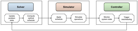 To provide a formal and modular representation of the proposed dynamic rescheduling framework, Algorithm 1 describes the overall procedure at 1-min intervals, explicitly reflecting the roles of the Solver, Simulator, and Controller modules.
