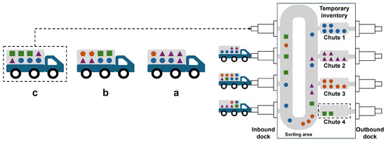 Figure 5, where the temporary inventory storage capacity is limited to eight units distributed across multiple outbound chutes. If trucks are scheduled strictly based on their arrival order (a–b–c), cargo from truck