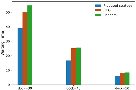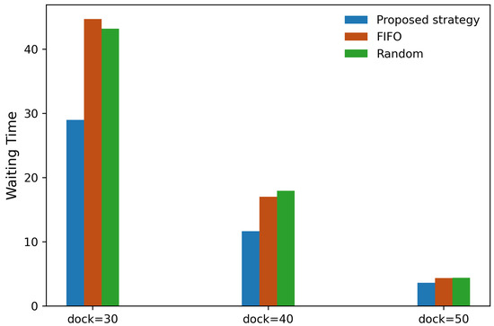 To further evaluate the robustness of the proposed strategy under varying capacity conditions, a comparative analysis was conducted using different numbers of inbound docks (30, 40, and 50) and outbound docks (98 and 148). The proposed strategy was compared with two baseline methods: FIFO and Random strategies. The performance comparison of each strategy across various combinations of inbound dock and outbound dock configurations is summarized in