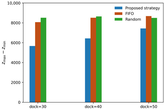 In this section, a comparative experiment was conducted to verify the effectiveness of the proposed strategy against the following two conventional methods: First-In First-Out (FIFO) strategy and the Random strategy. Each strategy was evaluated through 30 independent simulation runs under a configuration with 50 inbound docks. Two performance indicators were used as follows: (1) temporary inventory storage balancing, measured by