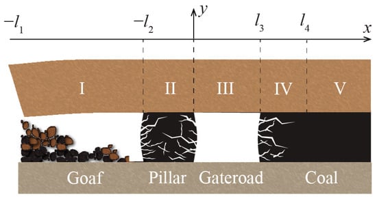 By utilizing the initial boundary conditions at the end face of the rock beam and the continuity conditions at the interface, and combining the mechanical equations of rock beam I and rock beam V, the mechanical model of the hard roof can be solved [16,17,27]. Using the constructed roof mechanical model, the stress state of the roof can be quantified, thereby enabling analytical analysis of the coal pillar size and its control effect on the roof.