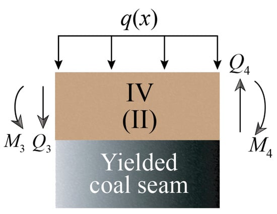 Rock beam IV is a finite-length beam supported by plastic coal in front of the working face. The left end of rock beam IV is subjected to bending moment M3 and shear force Q3 at the interface between rock beams III and IV, while the right end is subjected to bending moment M4 and shear force Q4 at the interface between rock beams IV and V. The upper part is subjected to a non-uniformly distributed load , and the lower part is subjected to the supporting reaction force provided by the plastic coal; its mechanical model is shown in Figure 5. The mechanical model of beam IV is consistent with that of beam II, and is not described in detail here.