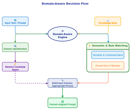 This section presents a detailed description of the domain-aware decision flow underlying DA-RLPO, illustrating the integration of domain-awareness into the prompt optimization process. As illustrated in Figure 1, the approach centers on a domain-aware engine. This engine processes the initial task prompt and incorporates both semantic and rule-based information from a structured knowledge base, enabling accurate recognition of domain relevance and guiding subsequent editing decisions. Specifically, the input prompt is first processed by a domain identification module, which determines the specific domain associated with the current task. Based on the identified domain, the candidate action space for editing is further constrained by domain knowledge, which effectively reduces the search space and improves the efficiency of the editing process. The domain-aware engine interacts closely with the knowledge base to retrieve and generate candidate phrases that are contextually appropriate for the task, taking into account both semantic similarity and domain-specific rules and metadata. These domain-relevant phrases are then used by the editing module for insertion or substitution, resulting in an optimized prompt with explicit domain characteristics. This decision flow highlights the core feature of the proposed method: prompt editing is achieved through systematic incorporation of domain knowledge and semantic constraints, allowing the framework to produce prompts that are both efficient and contextually appropriate for the identified task domain.