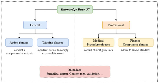 The structure represents domain-specific knowledge and syntactic granularity. As shown in Table 1, phrases are organized by high-level application domains such as general, medical, and financial. Each phrase is further annotated with its syntactic type, including noun phrases (NPs), verb phrases (VPs), and conditional clauses. This organization enables controlled and flexible phrase-level modifications during editing, while preserving fluency.