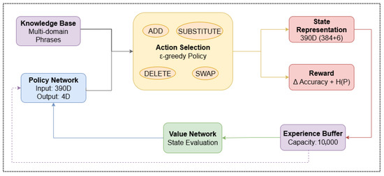 This section details the reinforcement learning framework adopted for prompt editing. The optimization procedure is formulated as a Markov Decision Process. The state space integrates semantic and statistical features. The action space consists of discrete phrase-level editing operations, which are restricted by rule-based validity constraints. The reward function incorporates both task-specific performance and the entropy of the recent action distribution. Candidate edits are retrieved from the structured knowledge base according to syntactic, semantic, and contextual relevance. Model training is conducted with a Deep Q-Network utilizing experience replay and periodic target network updates. An overview of the entire process is presented in Figure 3. The subsequent subsections formally define each component and provide implementation details.