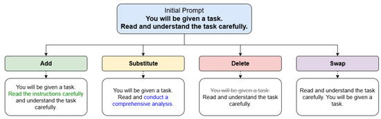Examples of prompt modifications produced by four discrete editing actions applied to the initial prompt. Each resulting prompt is independently generated through a single-step transformation.