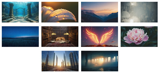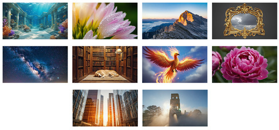 Figure 5 and Figure 6 show the visual comparisons between images generated using the original and the optimized prompts for ten distinct topics (Sunken Palace, Golden Petals, Mountain Dawn, Misty Mirror, Starlit Sky, Library Dog, Flaming Flight, Morning Peony, Urban Sunrise, and Blazing Tower). It is evident that the images generated using prompts optimized by the proposed method demonstrate notable improvements in visual quality and thematic coherence compared to those generated by the initial prompts.
