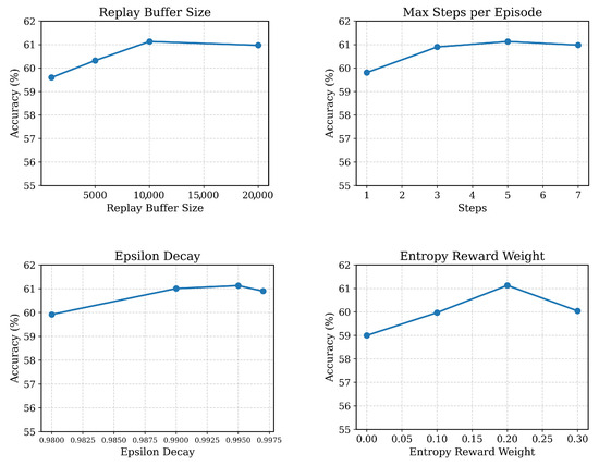 The epsilon decay rate governs the exploration–exploitation trade-off in policy learning. We compared decay values of 0.98, 0.99, 0.995, and 0.997. Figure 7 (bottom-left) demonstrates that an appropriate balance between exploration and exploitation yields the highest accuracy, while too-rapid or too-slow decay reduces overall performance.