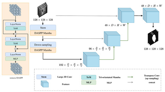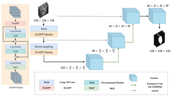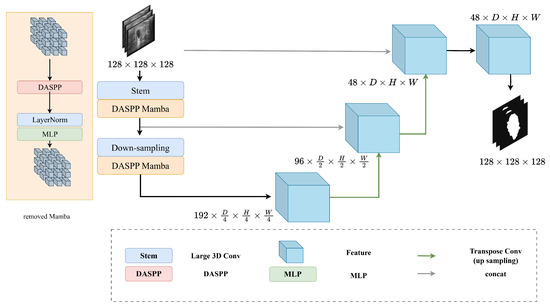 - Xing, Z.; Ye, T.; Yang, Y.; Liu, G.; Zhu, L. Segmamba: Long-range sequential modeling mamba for 3d medical image segmentation. In Proceedings of the International Conference on Medical Image Computing and Computer-Assisted Intervention, Marrakesh, Morocco, 6–10 October 2024; Springer: Cham, Switzerland, 2024; pp. 578–588. [Google Scholar]