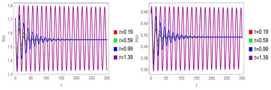 For these values, the equilibrium point is S0 = 1.5526, R0 = 0.4166. The threshold value for the time delay is τ0 = 1.39.
