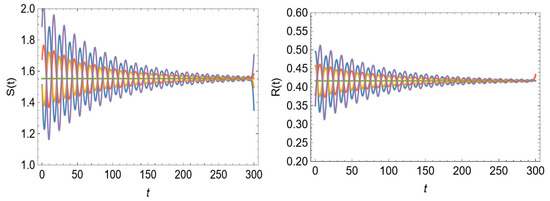 In Figure 1, we can visualise the level of external reporting requirements for sustainability S(t) and the capacity of banks to respond to these requirements R(t), choosing the initial conditions in the neighbourhood of the equilibrium point and different values of time delay, less than or equal to the critical value.