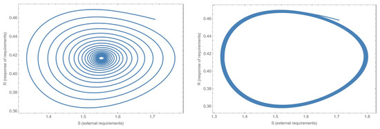 The orbits in the phase plane (S, R) for τ = 1.2 (left) and τ = 1.39 (right). A supercritical Hopf bifurcation takes place.