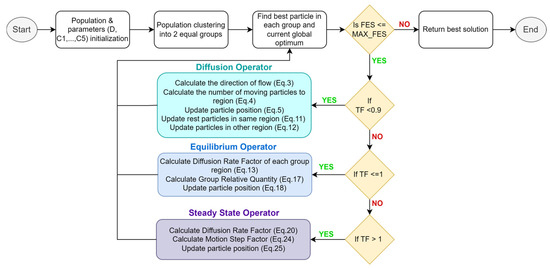| 1: Initialization phase 2: initialize parameters 3: initialize the population 4: Clustering: Divide population into two groups 5: for do 6: create the opposite molecules in group : (where U and L are upper and lower bounds, respectively) 7: compute the fitness function for each module and its opposite in the group 8: compare and its opposite and keep the best one 9: find the best molecule in each group and the global optimum 10: end for 11: while do 12: if then (Diffusion Operator) 13: Calculate the direction of flow (Eq.3) 14: Calculate the number of moving particles to region (Eq.4) 15: Update particle position (Eq.5) 16: Update rest particles in same region (Eq.11) 17: Update particles in other region (Eq.12) 18: end if 19: if then (Equilibrium Operator) 20: Calculate Diffusion Rate Factor of each group region (Eq.13) 21: Calculate Group Relative Quantity (Eq.17) 22: Update particle position (Eq.18) 23: end if 24: if then (Steady State Operator) 25: Calculate Diffusion Rate Factor (Eq.20) 26: Calculate Motion Step Factor (Eq.24) 27: Update particle position (Eq.25) 28: end if 29: for do 30: Calculate opposite molecules in each group region 31: Compare the fitness score of each molecule with its opposite and keep the best 32: end for 33: Update FES 34: Find current best optimum and update global optimum 35: end while 36: Return best solution |