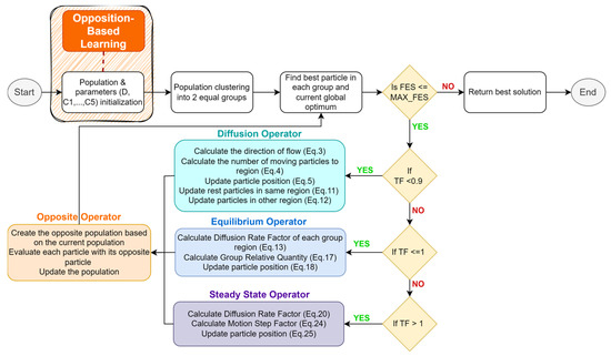 After initialization, the FLA typically updates the population during each iteration based on the principles of Fick’s law (diffusion operator, equilibrium operator, and steady-state operator). Here, OBL can be applied in the update process to further enhance the solution space search: