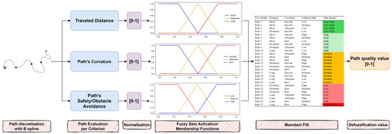 To address real-world multi-objective optimization problems, the proposed FLA-OBL algorithm will be enhanced with fuzzy logic (FFLA-OBL). Specifically, the Mamdani Fuzzy Inference System (FIS) will be integrated into the evaluation process of the FLA-OBL algorithm (Figure 3). In Section 3, the implementation of the FIS for the multi-objective path planning problem in cases of UAV missions and obstacle avoidance is presented analytically.