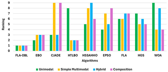 Based on the statistical analysis using MWU tests, FLA-OBL demonstrated significantly superior performance in 178 cases, exhibited statistically equivalent performance in 12 cases, and was significantly outperformed in only 23 cases (Table 7). Furthermore, FLA-OBL achieved statistically significant improvements across all categories of benchmark functions, including unimodal, simple multimodal, hybrid, and composition functions (Table 8). Post hoc comparisons further confirmed that FLA-OBL consistently outperformed all competing algorithms in each function category, as illustrated in Figure 10.