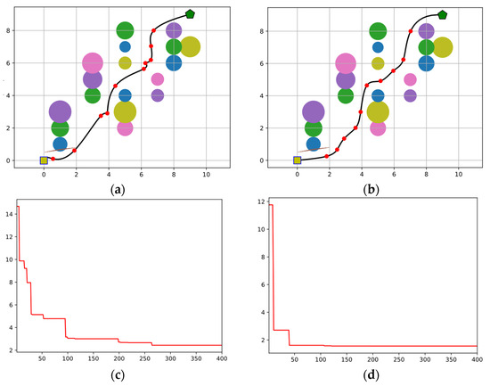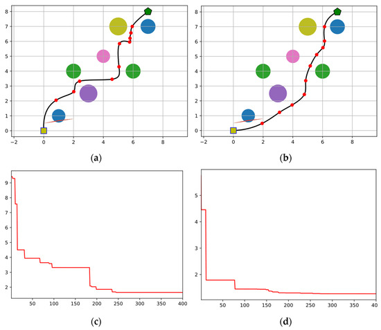 Optimal path and convergence plots generated by (a,c) FLA and (b,d) FFLA-OBL for a scenario with 12 obstacles.