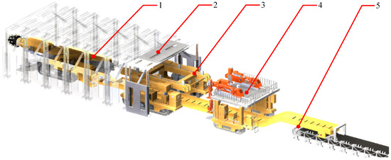 Fast excavation construction operation line with parallel excavation, support, and anchoring (1—excavation robot, 2—temporary support robot, 3—support transport robot, 4—drilling and anchor robot, 5—carrier robot).