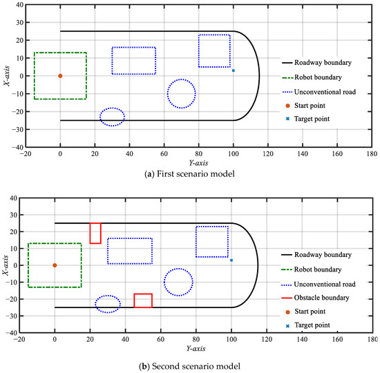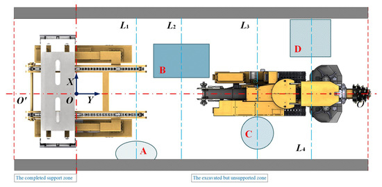 Based on the principle of parallel construction technology for excavation, support, and anchoring using robotic excavation machine groups, the comprehensive excavation roadway model can be divided into two parts: the left side represents the roadway space where support has been completed, and the right side represents the roadway space where excavation has been completed but support has not yet been applied. For this purpose, a local restricted roadway environment model with spatial projection is established: using the horizontal central axis OO’ of the roadway as the reference, a straight line perpendicular to OO’ as the X-axis, and the excavation direction of the roadway as the Y-axis, a coordinate system is established. The construction area, with a width of 3500 mm and a length of 12,000 mm, is scaled down by a factor of 1000 to establish a local restricted roadway environment model in two-dimensional coordinates, as shown in Figure 3. In Figure 3, points A, B, C, and D represent the complex road conditions of the roadway floor during the travel of tracked roadheaders in certain sections of the roadway, referred to as unconventional road condition areas within the local restricted roadway.