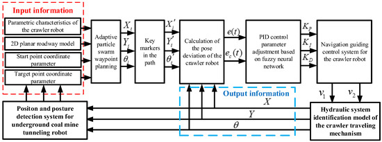 Aiming at the complex construction environment and autonomous navigation challenges in underground coal mine roadways, this paper proposes a path navigation and deviation correction control method for tracked roadheaders in confined roadway spaces. First, a two-dimensional planar grid model of the working scenario was constructed, with dimensionality reduction in the roadway model achieved through a heading reference influence degree threshold of the tracked roadheaders. Based on the kinematics theory of tracked roadheaders, kinematic and dynamic models for deviation correction in fully mechanized excavation roadways were established. Subsequently, a path planning and tracking correction algorithm was developed, along with a heading deviation correction control algorithm based on fuzzy neural network PID. Online optimization of the particle swarm algorithm was realized through crossover-mutation operations, enabling optimal strategy solving for construction path planning and precise control of travel deviation correction. Finally, simulation experiments evaluating algorithm performance and comparative simulations of control algorithms validated the feasibility and superiority of the proposed method. This research provides strategic guidance and theoretical foundations for rapid precision deployment and intelligent deviation correction control of tracked engineering vehicles in confined underground coal mine spaces.
