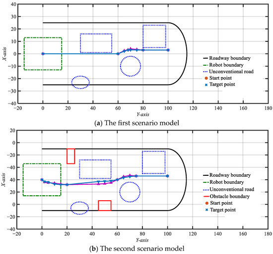 Based on the position information of the established two-dimensional plane roadway model, the crawler support vehicle obtains the initial point heading angle θ0 and the target point heading angle θg through the pose detection process. Then, in a construction cycle, the change in the vehicle’s heading angle Δθ and the total path length [L] can be expressed as follows: