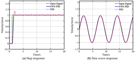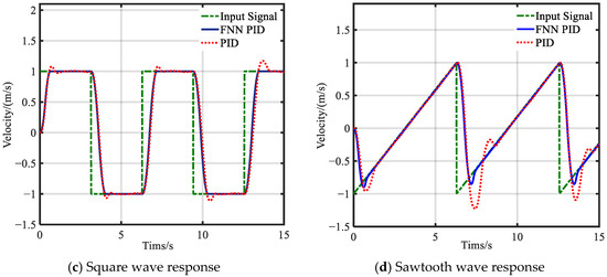 At the same time, tracked roadheaders often need to perform repeated position and orientation detection and tracking deviation correction control during construction operations. Therefore, sine wave, sawtooth wave, and square wave signals were used as input signals for dynamic tracking deviation correction simulation experiments. The simulation results are shown in Figure 14b–d. The system using the FNN PID control algorithm reduced the response time by 90.4%, 37.1%, and 52.42% under the input of sine wave, sawtooth wave, and square wave signals, respectively. The dynamic errors caused by external disturbances were reduced by 23.85%, 75.91%, and 94.01%. It can be seen that the FNN PID control algorithm can maintain good stability in complex working conditions. The specific simulation data is shown in Table 8.