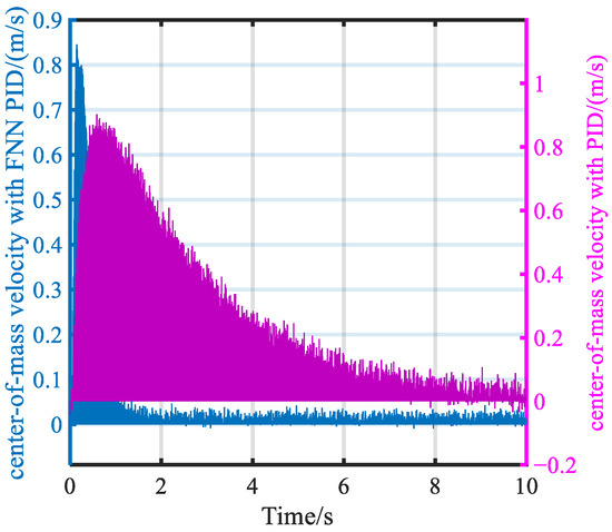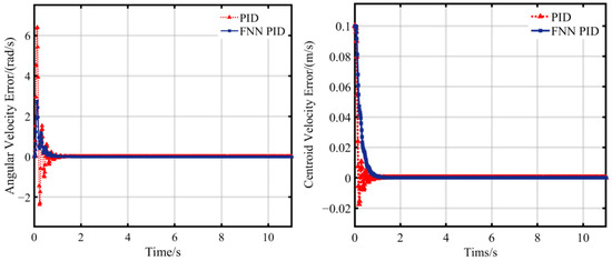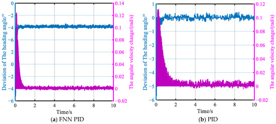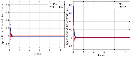 Figure 16 shows the variation curves of the rotational speed of the crawler tracks on both sides during the path navigation motion of the tracked roadheaders. In Figure 16, the FNN PID also has a slightly slower response speed compared to the traditional PID control system, but the oscillation amplitude generated by the traditional PID control system is particularly noticeable. The repeated oscillation of speed errors may lead to chattering phenomena during the vehicle’s heading correction. The specific simulation data are shown in Table 8.