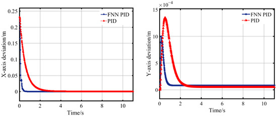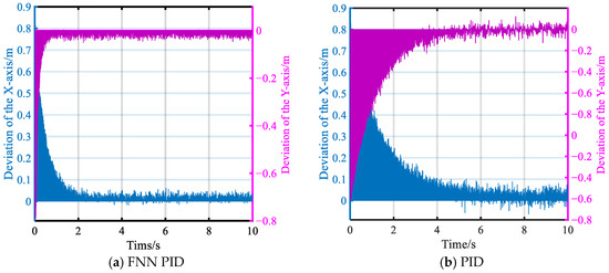 Figure 17 shows the variation curves of the X-axis and Y-axis coordinate deviations of the vehicle during the path point tracking and deviation correction control of the tracked roadheaders. In Figure 17, when the tracked roadheaders are performing navigation and deviation correction motion, the response time of the FNN PID control is reduced by 82.48% compared to the traditional PID control system, and the overshoot is reduced by 23.07%. The specific simulation data is shown in Table 8.