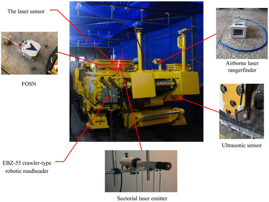 The EBZ-55 tracked roadheaders are equipped with a YHJ001 onboard laser rangefinder and a CAR-N28 ultrasonic sensor as auxiliary measurement components, mainly for measuring the vehicle’s travel distance, the distance between the vehicle body and the obstacles, and the distance to the simulated tunnel. The laser rangefinder has a measurement accuracy of 0.01 mm, and the ultrasonic sensor has a measurement accuracy of 1 cm. The FOSN fiber optic strapdown inertial navigation system can measure the vehicle’s heading angle and position coordinates in real-time during travel. The related pose detection system is shown in Figure 18.