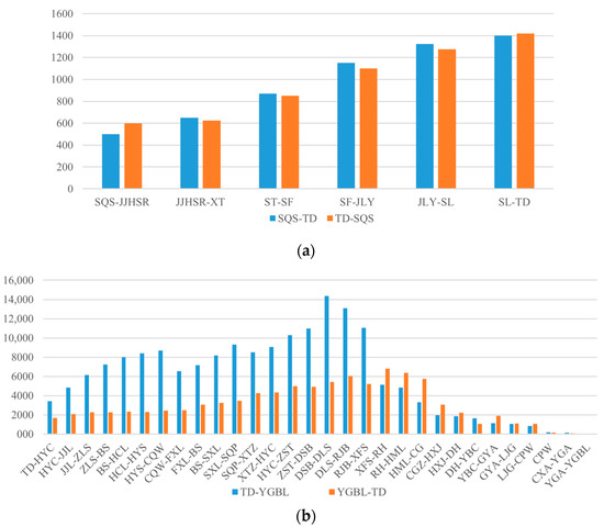 Weekday peak section passenger flow in Chongqing’s URTN: (a) Metro Line 5; (b) Jiangtiao Line.