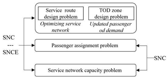 Our problem consists of three interconnected subproblems, as illustrated in Figure 2: the service network capacity (SNC) subproblem, the service network capacity enhancement (SNCE) subproblem, and the passenger assignment (PA) subproblem.