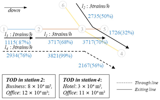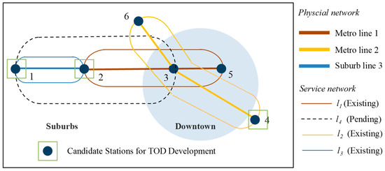 Taking the URTN shown in Figure 3 as an example, the physical network comprises six stations, two urban railways, and one suburban railway. The existing service network consists of service routes 1, 2, and 3: route 1 is a local service route for a suburban railway, and routes 2 and 3 are local service routes for an urban railway. Route 4 is an alternative route for a through-service line, and stations 5 and 8 are considered as alternative TOD stations. This study aims to evaluate the network’s service capacity and explore strategies to enhance its performance.