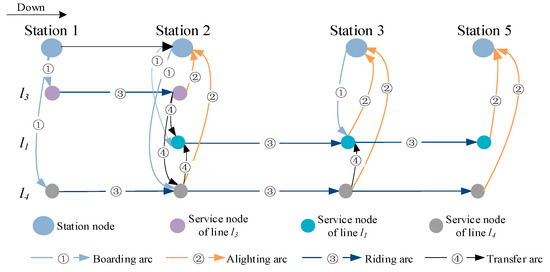 Before optimizing passenger assignments, the service network must be constructed based on the operational plan. Figure 4 illustrates the complete service network, depicting a passenger’s journey during rail transit travel; passengers go through several stages, including entry, waiting, boarding, transfer, and alighting. We quantify passenger service quality on different feasible paths using passengers’ generalized travel costs (GTCs). Different weights are assigned to various components of the entire travel process, including travel time, number of transfers, and train crowding. For each path, the generalized travel cost is calculated in Section 3.4.2.