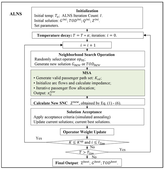 This paper integrates the ALNS algorithm and the MSA algorithm to propose a heuristic iterative approach. The ALNS algorithm, developed by Ropke and Pisinger [38], combines large neighborhood search with an adaptive mechanism, enabling the dynamic selection of optimal neighborhood structures based on prior search outcomes [39]. In the context of rail transit, Canca [40] and Chen [21] have successfully applied ALNS to optimize network designs, demonstrating its ability to achieve high-quality solutions within practical timeframes. The MSA algorithm, an iterative method widely used in traffic assignment and network optimization problems, is particularly effective for addressing stochastic user equilibrium issues [41]. It iteratively updates flow distributions using a successive averaging approach, gradually converging to an equilibrium state by employing the reciprocal of the iteration count as the step size.