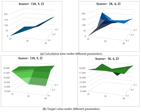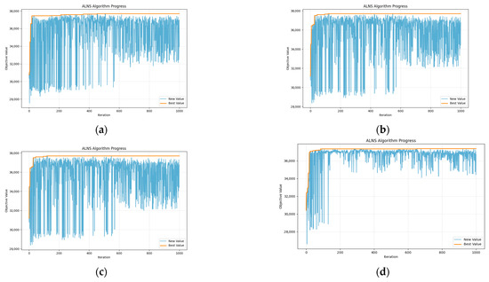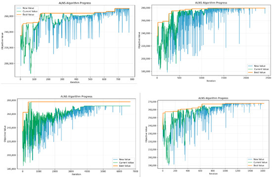 For this instance, following the procedure in Section 5.1.2, we tuned key parameters by running the ALNS algorithm 20 times and plotted selected convergence curves in Figure 14. Based on these results, we adopted the optimal parameter settings for all subsequent computations.