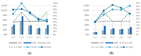 To further analyze the impact of TOD scale and property types on network service capacity and passenger flow, various scenarios were generated by modifying the constraints of TOD design. The relevant parameters and results of the tests are listed in Table 8. For instance, T4V30TOD3 indicates that there are four candidate property types, the developable volume for each type is 30 (104 m2), and TOD projects are allowed at a maximum of three stations.